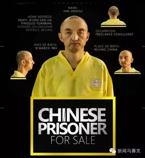 SALE)的字样。其中中国人质囚衣右上角标签显示姓名“FANJINGHUI”,编号“05675”,生于1965年3月18日,职业是自由咨询师;家庭地址为:502411,XIJING SAN UN,PINGGUOYUANNAN,DONGKO,SHIJINGSAN