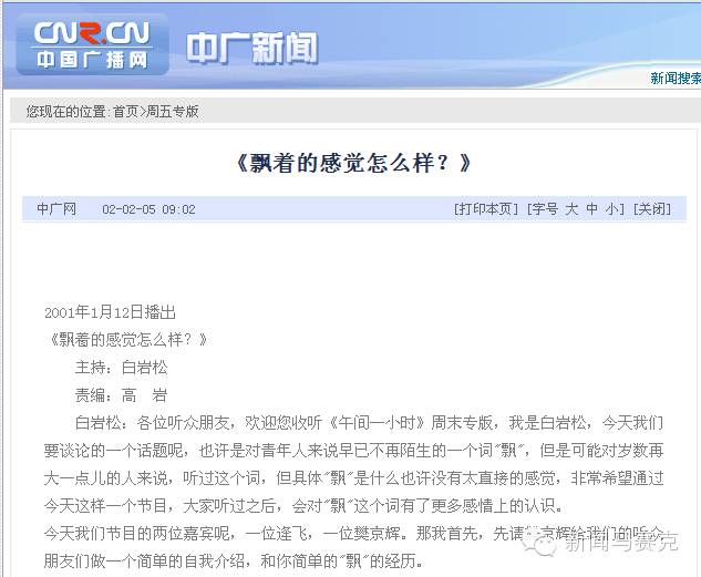 意外的是,央视主持人白岩松曾在2001年采访过樊京辉。白岩松当时还在中央人民广播电台主持《午间一小时》节目。采访樊京辉这期节目的主题是“飘着的感觉怎么样”。樊京辉在节目中说自己: