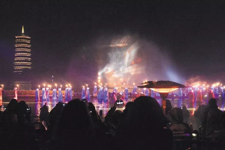 ▲万籁俱寂之时,湖面驶来一叶孤舟,忽而传来古琴曲《高山流水》,七弦轻抚,如玉石相触,悠远如天籁。空中花火如流光飞舞,烟花瀑布似银河倒悬。有舞者随琴音起舞,全息光影随衣袂斑驳流淌。时光缄默流淌的痕迹,仿佛尽在这一刻显现。