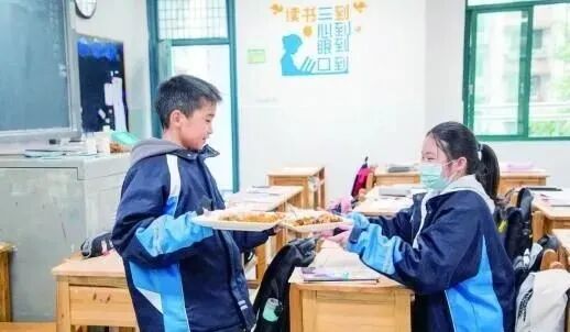 周钰涵同学因为摔跤不幸骨折,身为班级卫生委员的彭佳梁每次都会打好饭后先给周钰涵送到教室,自己再回食堂吃,吃完饭不忘回教室把餐盘送回食堂。原本教室到食堂5分钟路程,彭佳梁两三分钟跑着来回,为的就是让同学能够吃上热乎乎的饭菜。
