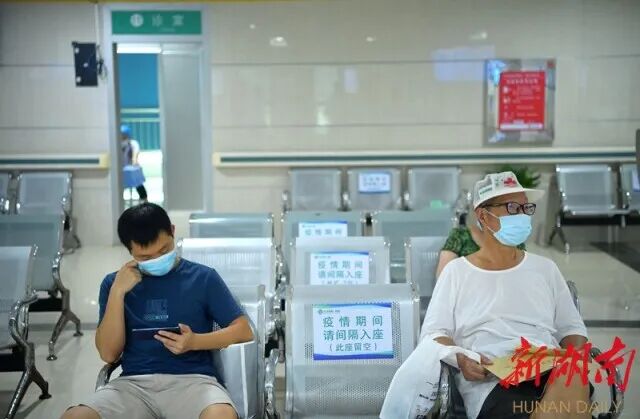 (8月2日,长沙市第一医院,患者在候诊大厅隔位候诊。近日,该医院启动防疫体系,通过就医患者分流、隔位候诊和检验健康码等形式,有序开展工作,让患者安全就医。新湖南客户端·湖南日报记者 唐俊 摄)