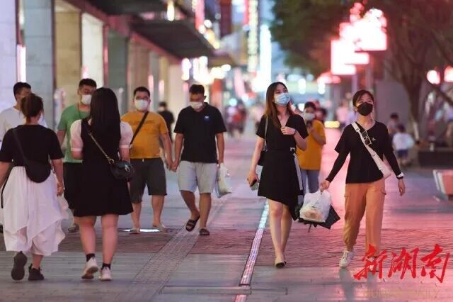 (8月2日19时30分,长沙市黄兴广场,市民佩戴口罩有序出行。湖南日报·新湖南客户端记者 傅聪 摄)
