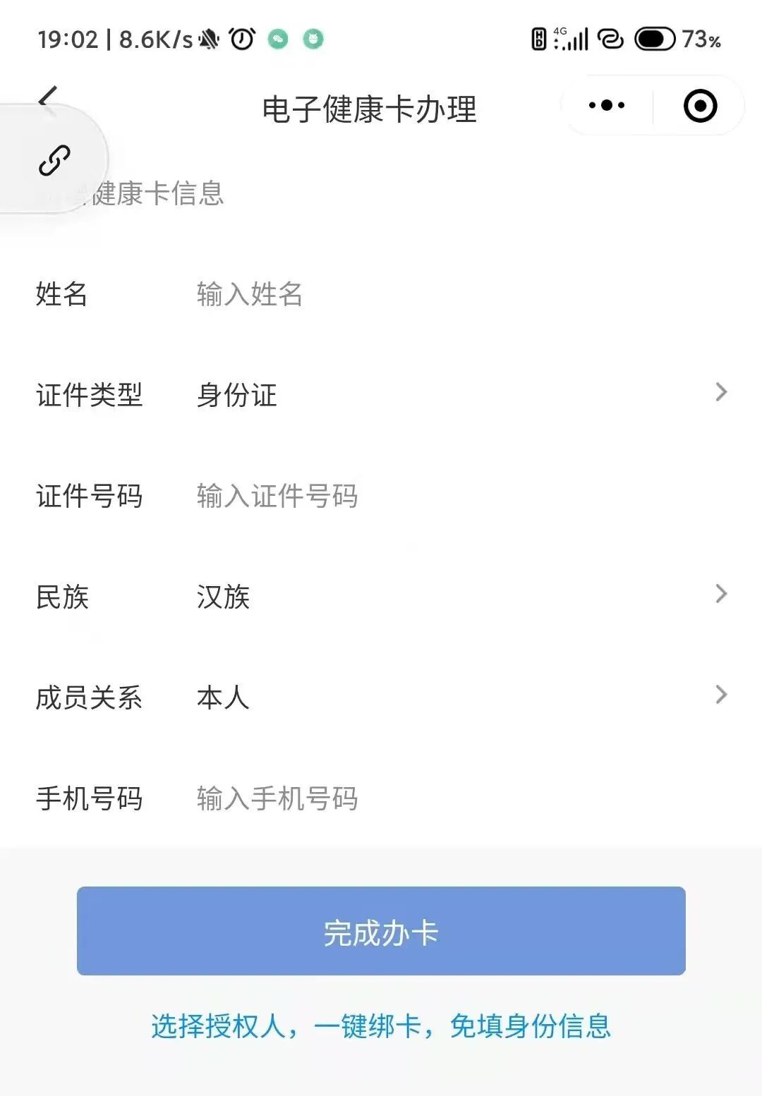 进入小程序后,点击“申领电子健康卡”随即跳出“用户授权”弹窗,点击同意授权后,系统自动填入身份信息,随后完成办卡。