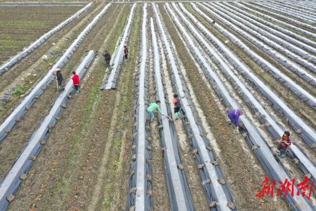 (3月23日,道县梅花镇宜阳村,农民在田间覆盖地膜。蒋克青 李昊璋摄影报道)
