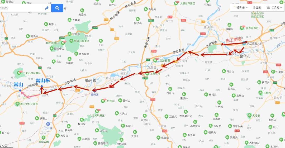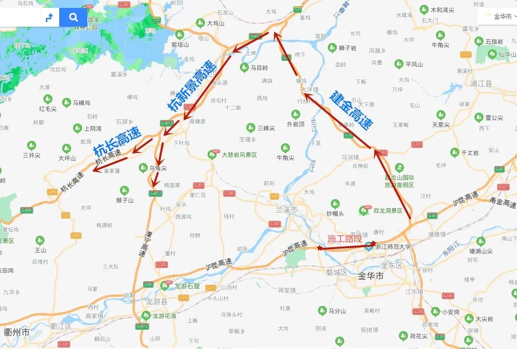 从金华出发的车辆,可从建金高速—杭新景高速—杭长高速、溧宁高速绕行,避开施工路段,前往衢州、江西、安徽方向。