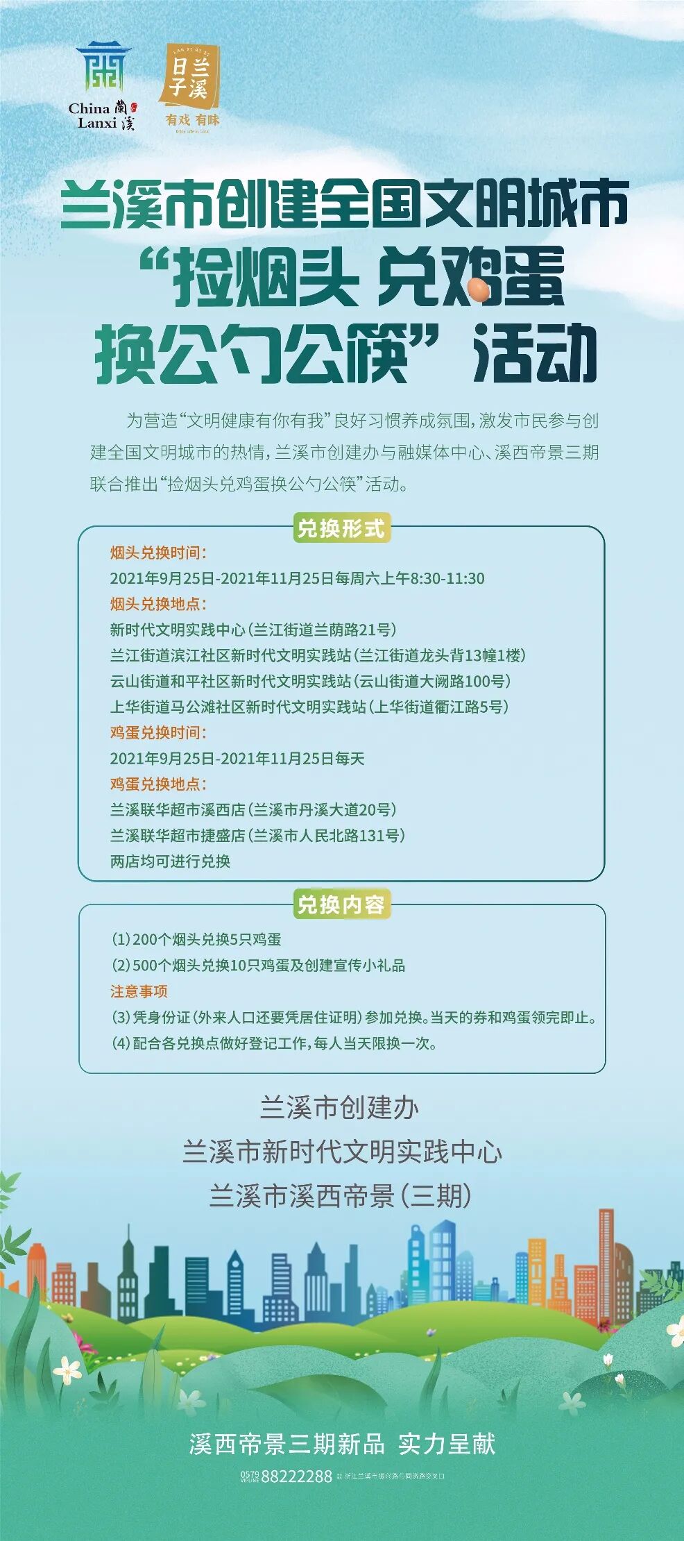 “捡烟头兑鸡蛋换公勺公筷”活动由兰溪市创建办、市融媒体中心联合推出,活动时间从9月25日起至11月25日结束,旨在通过捡拾小烟头这样的小行动来体现大文明,引导市民养成良好生活习惯,改善居住环境,突破城市管理“瓶颈”。同时,引导群众了解、参与新时代文明实践站所建设,进一步弘扬文明新风尚,并引导市民参与文明创建,营造“参与创建人人有责”的氛围。