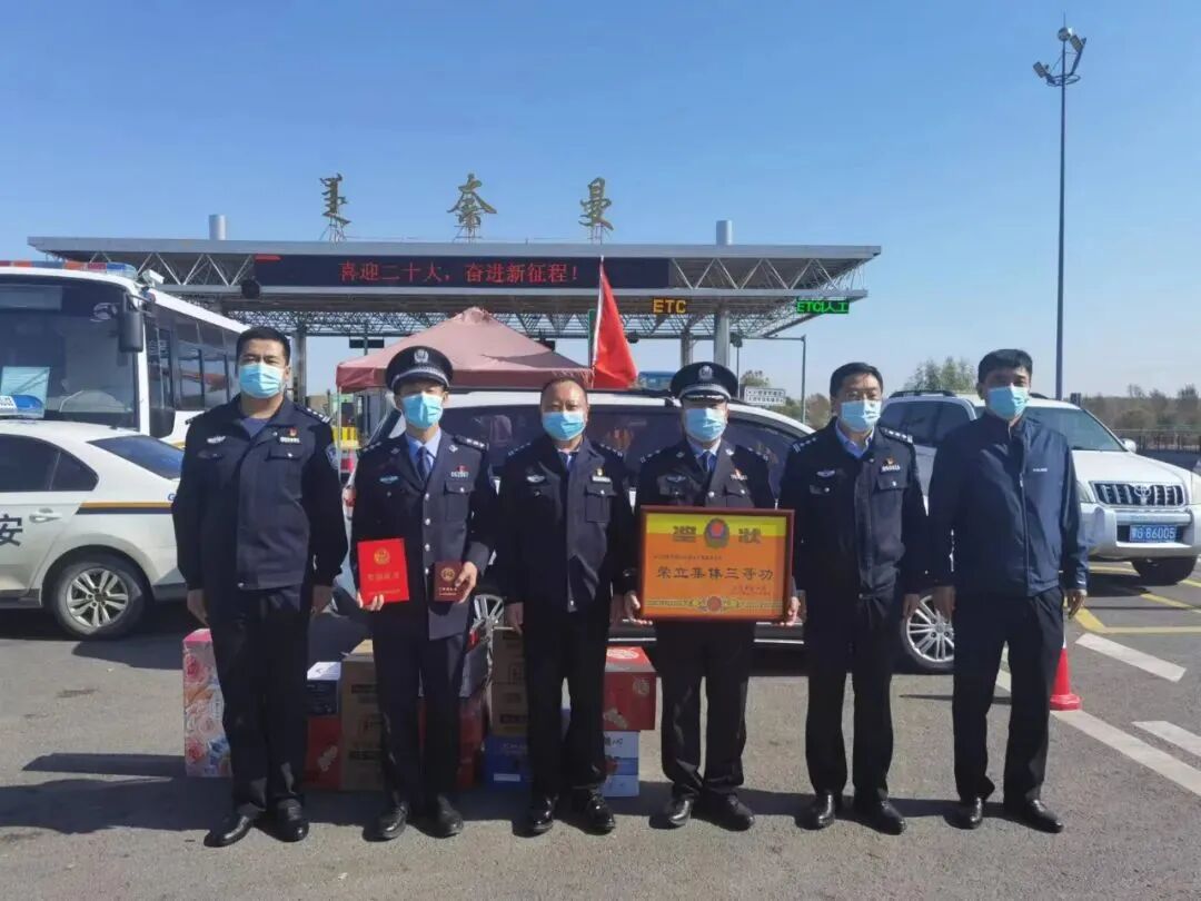 10月13日,市公安局党委副书记、常务副局长满成云一行深入科尔沁区高速执勤卡口督导检查党的二十大安保维稳、疫情防控等工作,看望慰问坚守一线的民警辅警,送奖到岗,并送上慰问品。并代表市局党委送奖到一线,为科尔沁分局荣立三等功的先进集体和个人颁发荣誉。在走访慰问中,满成云副局长实地查看、了解了一线民警、辅警值班备勤、防控措施落实、物资保障等情况满成云副局长对大家不怕疲劳、连续坚守的奉献精神给予充分肯定,叮嘱执勤值守民辅警注意自身防护和防寒保暖。