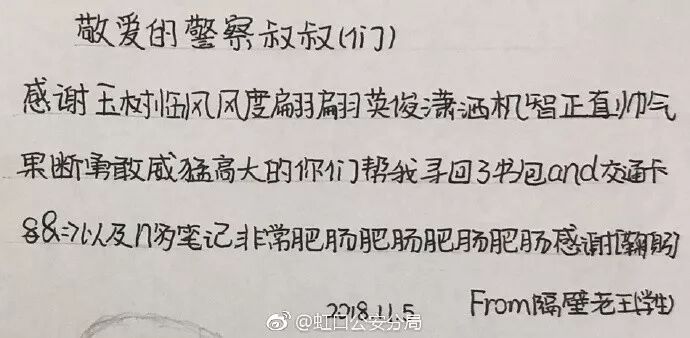 感谢玉树临风风度翩翩英俊潇洒机智正直帅气果断勇敢威猛高大的你们帮我寻回了书包and交通卡以及n多笔记非常肥肠肥肠肥肠肥肠感谢[鞠躬]
