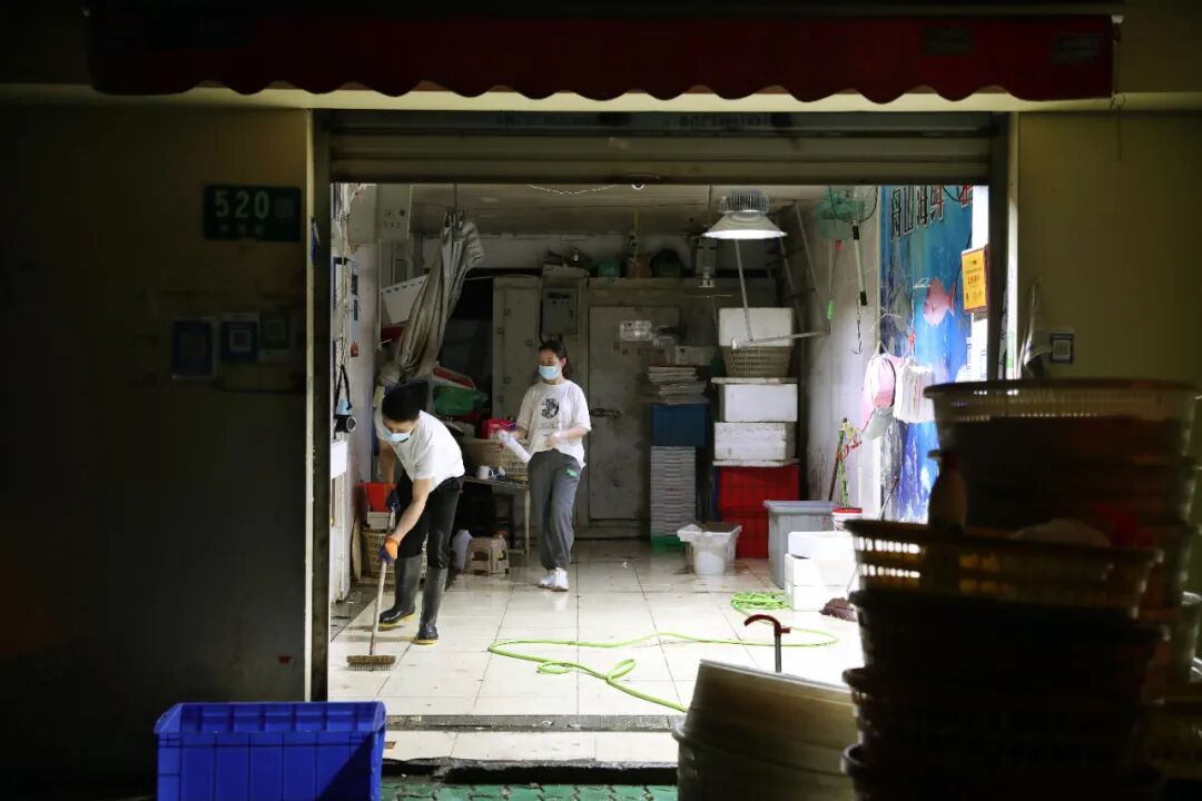 6月1日凌晨,上海市闵行区一家海鲜店的店主连夜清扫,准备恢复营业。这家店从3月底暂停营业。新华社记者 刘颖摄