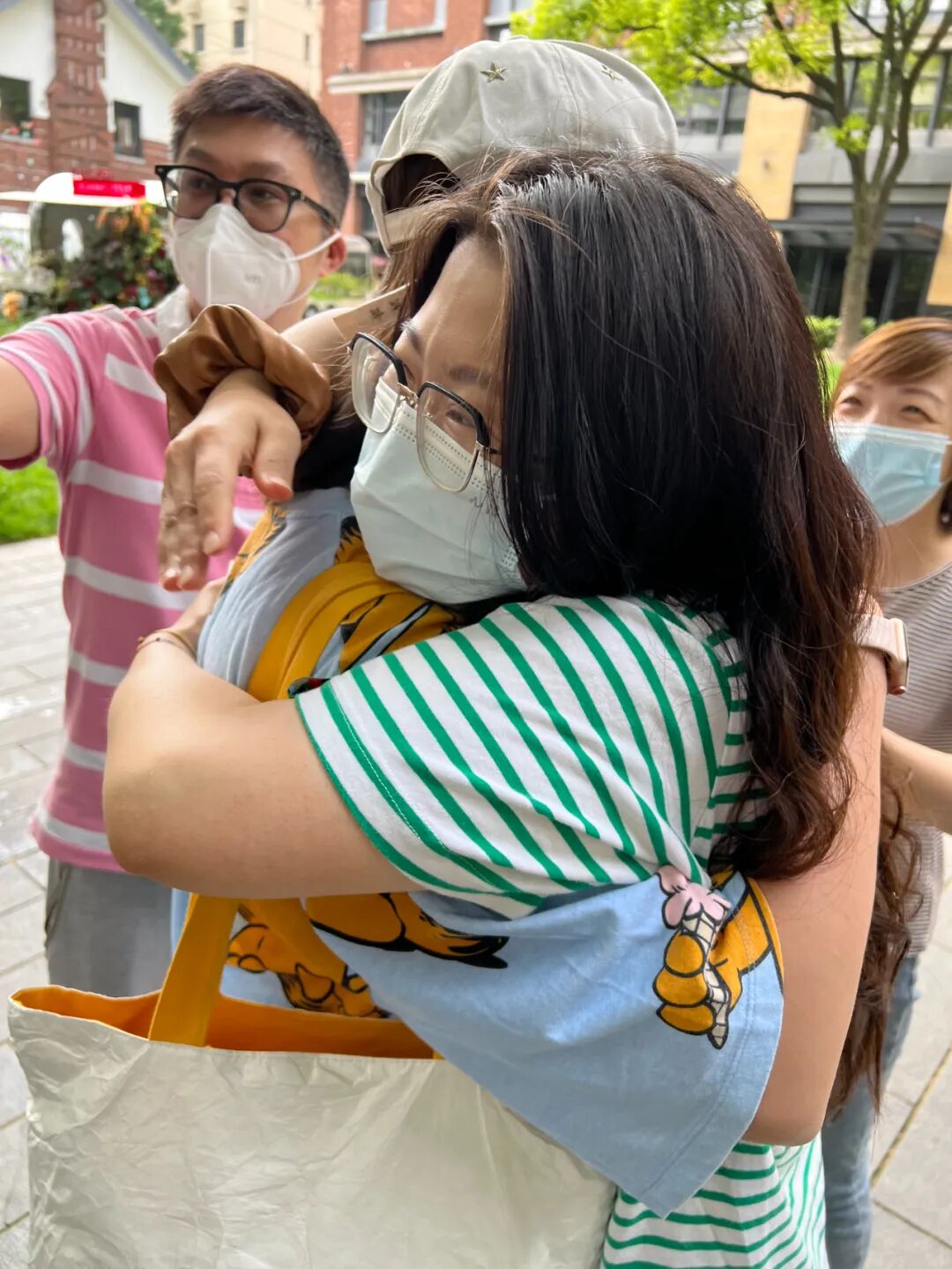 6月1日,在上海市长宁区愚园路上的创邑Space文化产业园区,市民相互拥抱。新华社记者 孙青摄