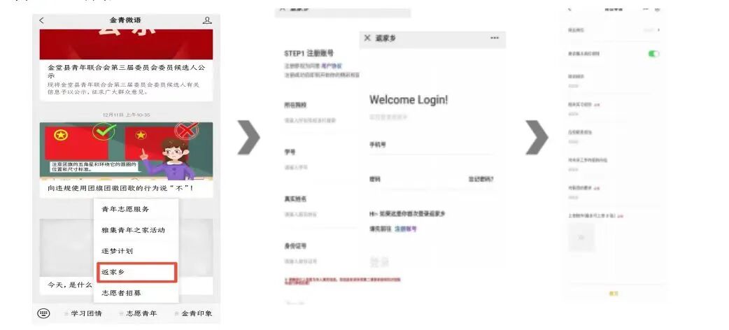 4.报名方式:(1)关注“金青微语”微信公众号,选择“志愿青年”—“返家乡”,注册并登陆,在系统里找到“中国共产主义青年团金堂县委员会”发布的岗位,选择中意岗位进行报名。