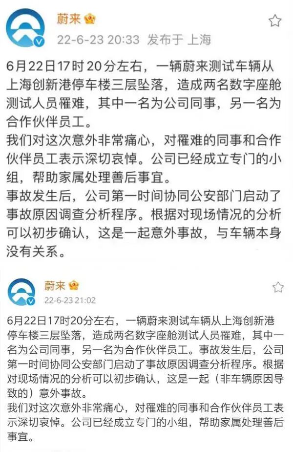 “6月22日17时20分左右,一辆蔚来测试车辆从上海创新港停车楼三层坠落,造成两名数字座舱测试人员罹难,其中一名为公司同事,另一名为合作伙伴员工。我们对这次意外非常痛心,对罹难的同事和合作伙伴员工表示深切哀悼。公司已经成立专门的小组,帮助家属处理善后事宜。事故发生后,公司第一时间协同公安部门启动了事故原因调查分析程序。根据对现场情况的分析可以初步确认,这是一起意外事故,与车辆本身没有关系。”