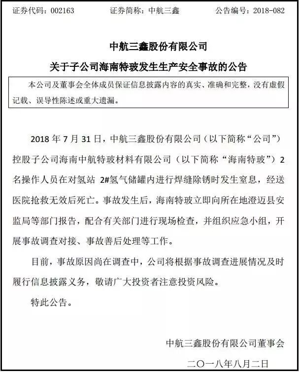 7月31日,中航三鑫股份有限公司控股子公司海南中航特玻材料有限公司(海南特玻)2名操作人员在对氢站 2#氢气储罐内进行焊缝除锈时发生窒息,经送医院抢救无效后死亡。