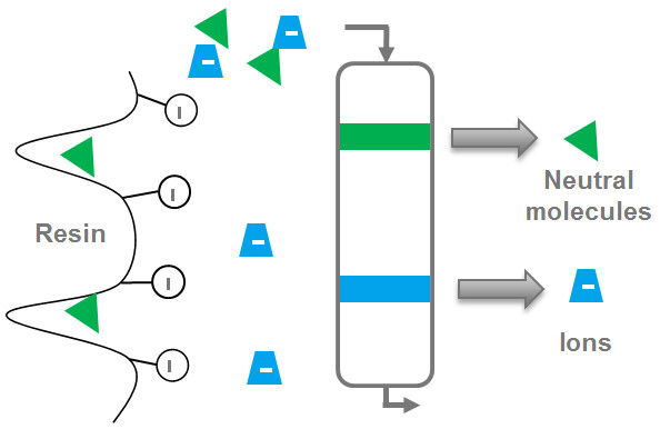 我们知道,层析分离依据的机理为混合物中不同组分因其物理−化学性质不同而在层析塔中的固定相(一般为树脂)与流动相(一般为水)间产生的不同的亲和力,盐类与中性分子(如氨基酸、有机酸、多元醇等)的分离可以说是该分离机理的典型应用,因为盐类在流动相中解离出的电荷会与固定相上负载的离子产生排斥作用而中性分子则不会(如图4所示),这样就使得盐类能更快地流出层析塔,从而实现与中性分子的有效分离。