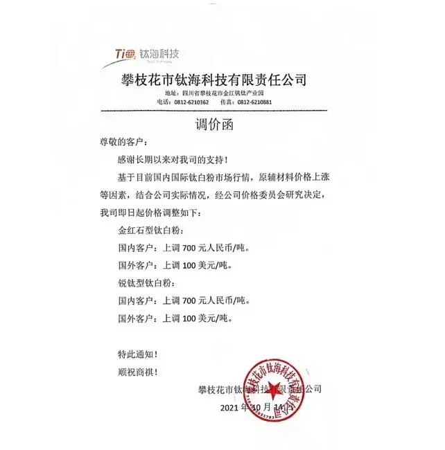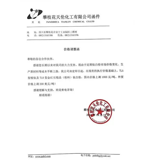 攀枝花天伦化工有限公司发布钛白粉调价函通知,由于近期钛白粉市场价格变化、生产原材料等成本不断上涨,经公司研究决定,自即日起,在现有的执行价格基础上,国内价格上调1000元/吨,外贸价格上调200美元/吨。