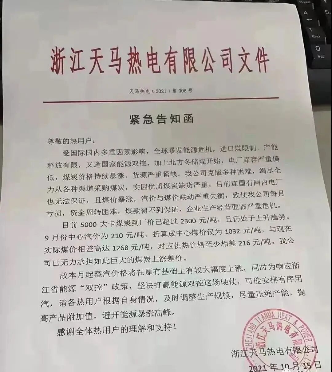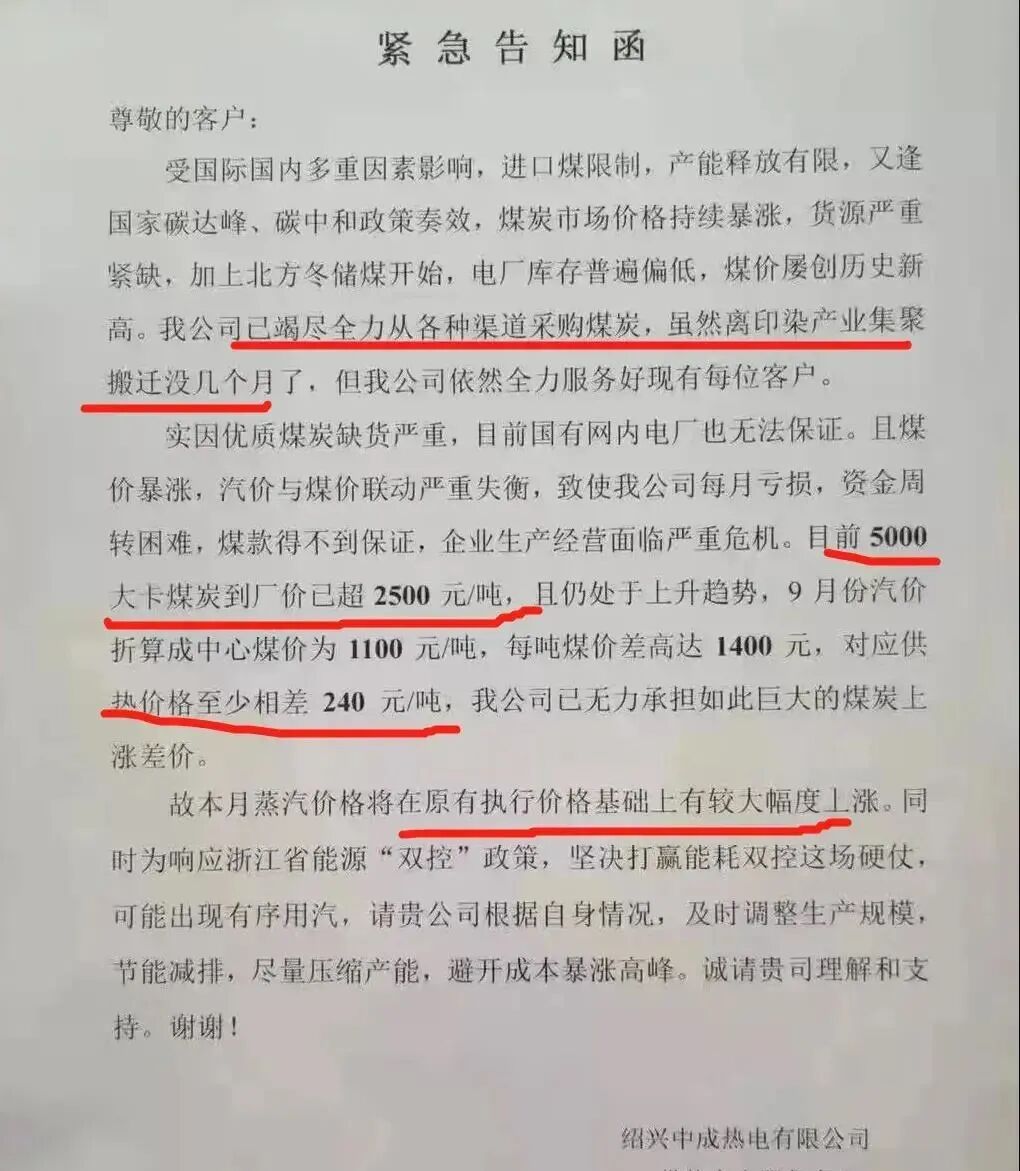 10月15日,绍兴多家热电公司发布《告知函》称,受全球多重因素叠加影响,市场煤炭供应十分紧缺、价格持续暴涨。目前所有北方港码头 5000大卡的煤,每吨价格已超过2300 元,仅有价无货,且每日一个价,紧张局面持续升级,煤炭采购相当困难。