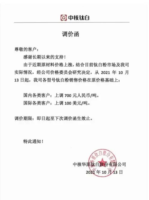 除此之外,钛海科技、中核钛白、惠云钛业等发布钛白粉涨价函通知称,国内客户上调700元人民币/吨、国外客户上调100美元/吨。