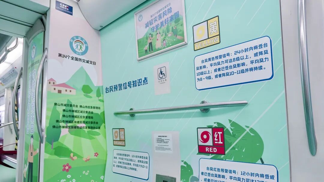5月12日是我国第14个全国防灾减灾日,为广泛宣传防灾减灾知识,提高广大市民的防灾避灾自救能力,佛山市围绕“减轻灾害风险,守护美好家园”主题,在广佛地铁一号线,由佛山市减灾委员会和市应急管理局、禅城区减灾委员会和区应急管理局,以及张槎街道减灾委员会和街道应急办,共同打造了全市首列“防灾减灾号”列车,主题列车共4节车厢,每节车厢分别设计为城市内涝、台风、地震、山体滑坡4大华南地区常见灾害种类: