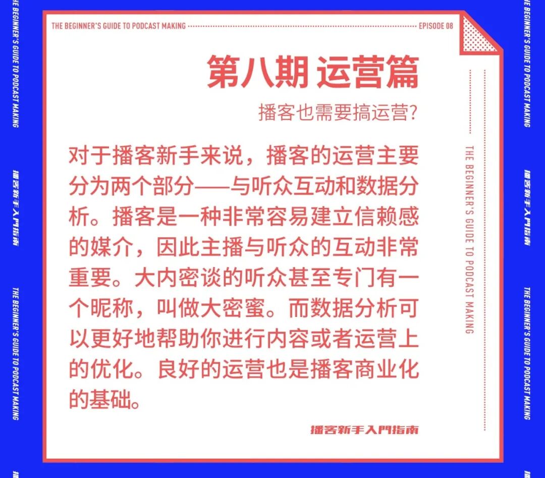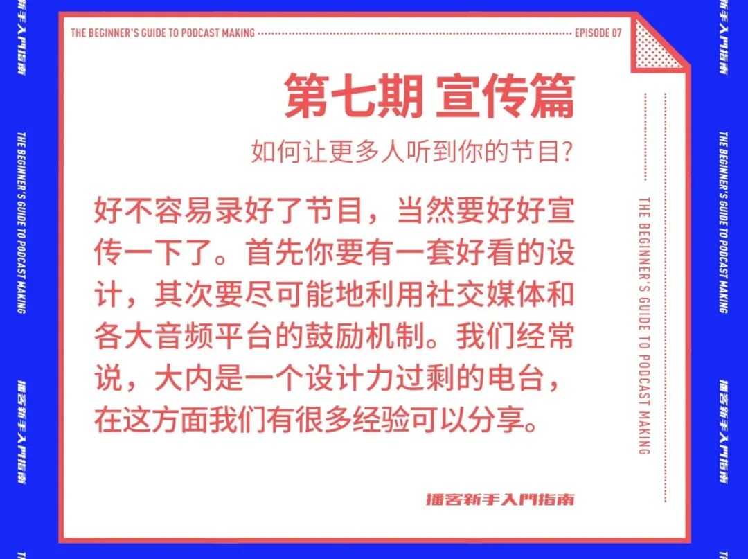 如果你听了这些节目,对做播客产生了一点兴趣,那我们还专门制作了音频版「播客新手入门系列」,用更直观更有趣的方式分享一些做播客的基础知识。我们希望用大内密谈800多期节目的经验,帮大家少走一些弯路,更快更好地创造出高质量的播客内容。