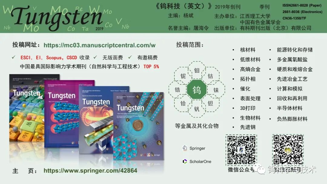 《Tungsten》 创刊于2019年,全球第一本以主要报道钨和相关金属及其化合物的英文科技期刊。由有科期刊出版(北京)有限公司运营,江西理工大学和中国有色金属学会主办。江西理工大学党委书记杨斌、有研科技集团有限公司屠海令院士分别担任主编、名誉主编。目前,《Tungsten》已被ESCI,EI,Scopus, CSCD等收据库收录,2023年将迎来首个影响因子。经过快速发展,期刊刊文范围已拓展至核材料、能源转换与存储、低维材料、多金属氧酸盐、高熵合金、拓扑材料、催化、硬质和难熔合金、生物医用材料、电子材料、先进冶金工艺、表面处理、3D打印、计算与模拟、回收和再利用等多个领域。