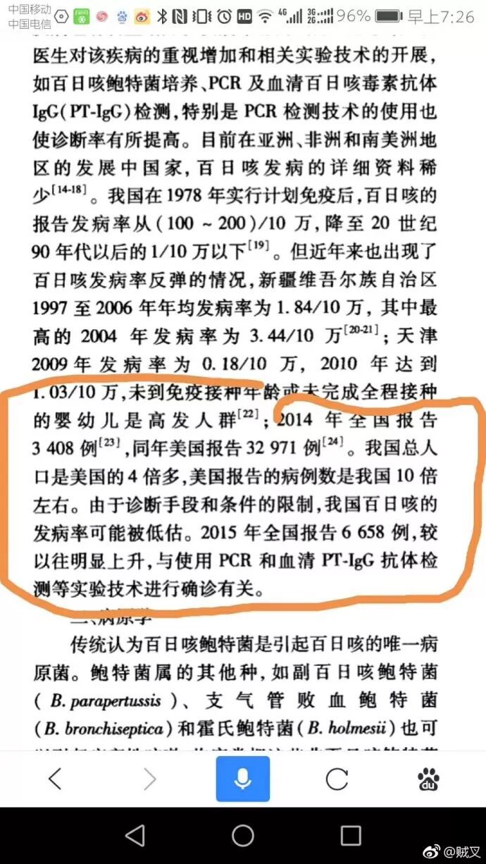 要知道,随着诊断试剂的普及诊断率提高了,也会让某种疾病发病率有显著提高。美国百日咳发病率比中国高,不一定是美国的疫苗不行,有可能是美国的就诊率、诊断水平比我们高。当然,前几年美国兴起了反疫苗行动也有可能导致百日咳发病率提升。有意思的,这种抵制接种疫苗的行为最早是上世纪80年代英国开始的,而起因是英国一名医生担心没人看病影响生意,号召大家去抵制疫苗。。。