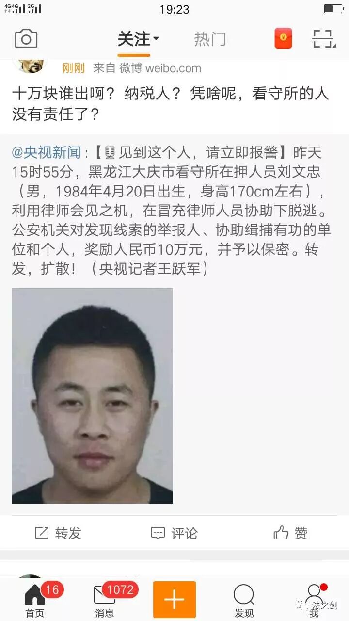 晚上7点多钟,新浪微博“央视新闻”发布消息:【见到这个人,请立即报警】昨天15时55分,黑龙江大庆市看守所在押人员刘文忠(男,1984年4月20日出生,身高170cm左右),利用律师会见之机,在冒充律师人员协助下脱逃。公安机关对发现线索的举报人、协助缉捕有功的单位和个人,奖励人民币10万元,并予以保密。