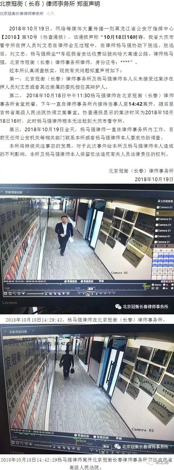 再结合杨马强律师所在的律师事务所的声明: 2018年10月18日中午11:30杨马强律师在北京冠衡(长春)律师事务所食堂就餐,下午一直在律师事务所内接待当事人至14:42离开,随后至吉林省高级人民法院协调立案事宜。协查通报显示的案涉时间为2018年10月18日16时,此时杨马强律师根本无法赶到大庆市看守所。