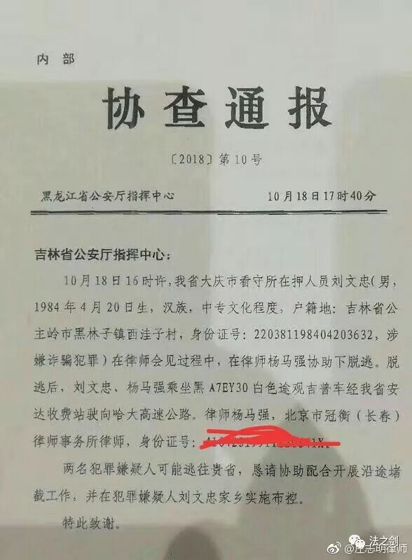 今天下午在朋友圈里看到一个协查通报,说的是大庆看守所在押人员刘文忠在律师杨马强帮助下逃脱的事。