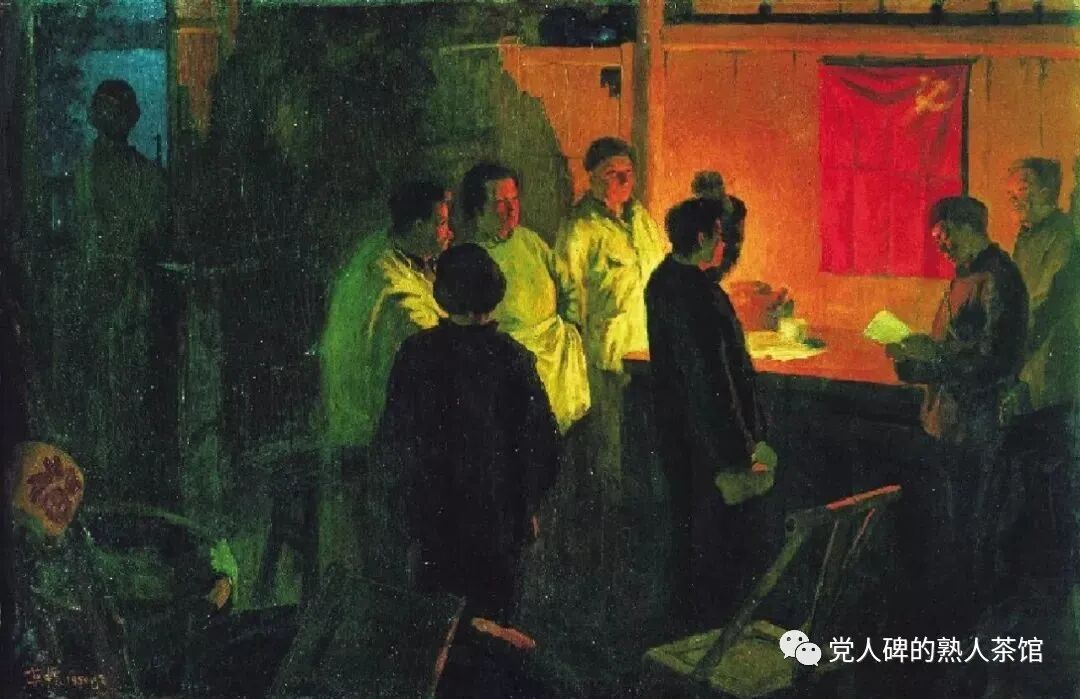 老陈家的阁楼上,没有党旗,也没有领袖像,大家面向西北,即党中央所在地延安的方向,山根宝同志举手宣誓:
