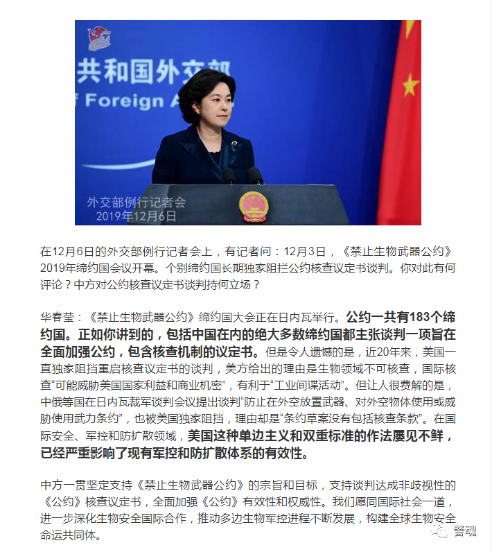 第三个事实:美国是所有的国家中唯一从联合国《禁止生物武器条约》中退出的一个国家,还是唯一一个长期的独家阻拦联合国《禁止生物武器公约》的核查议定书谈判的国家。