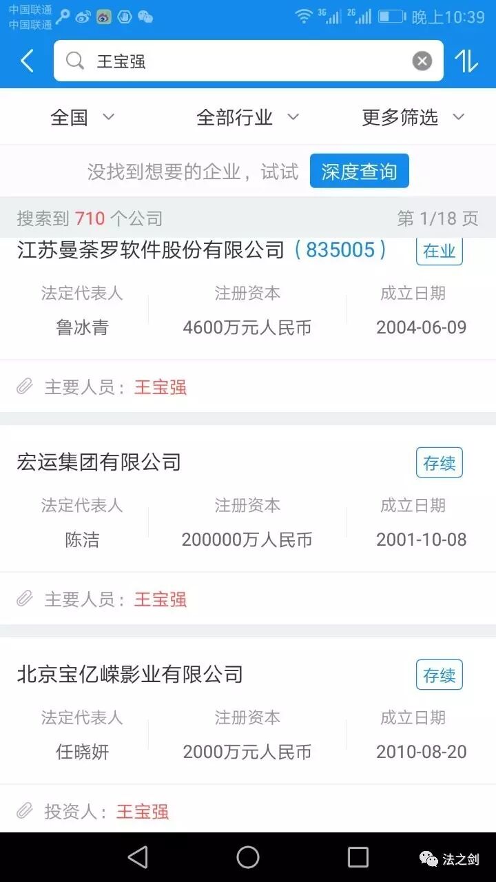 接着宝马宋的事谈。宋喆曾经是王宝强的经纪人,当然也就是王宝强的重要心腹了,基于这种身份,其参与王宝强控股的公司或王宝强实际控制的公司应该是顺理成章之事。本准备查询下王宝强的公司,了解点信息的,没想到一检索,710家公司,显然,在中国“王宝强”重名的太多了,本律也没办法分辨到底哪几个是明星王宝强的,算了,不影响继续唠叨。