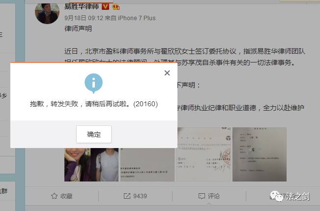 9月18日易胜华律师在微博发布声明,易胜华律师团队担任翟欣欣法律顾问,代为处理和应对苏享茂自杀事件相关法律事务。看到易胜华律师的声明,我本想评论支持下易律师的,可惜总是转发失败,看样子易律师早拉黑俺了,悲催啊!啥地方得罪他了?