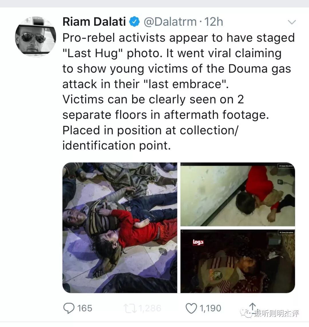在美英西方世界指责叙利亚阿萨德政府在叛军最后控制的一个据点DouMa镇动用化学武器毒害儿童炒作舆论之时,2018年4月9日下午5.39,为BBC工作担任国际新闻制片人的Raim Dalati发布推文: