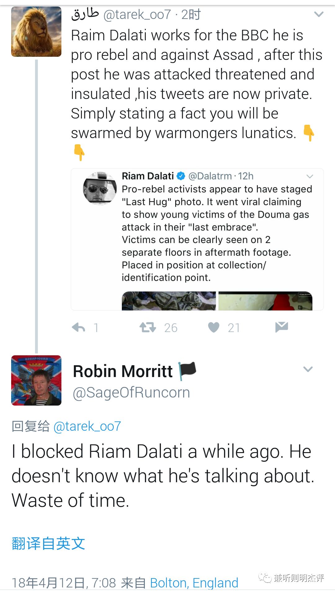 Raim Dalati为BBC工作,他的立场是支持叙利亚叛军和反对阿萨德政府,在这篇推文发布以后,他受到大量攻击威胁甚至被管控,他的推特现在是封闭状态。这告诉我们一个简单的事实,你身边都是好战的疯子![]()