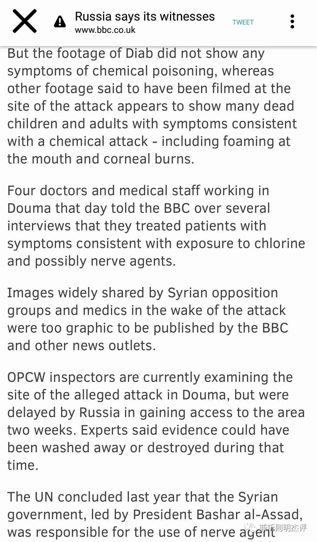 那天在杜马工作的四名医生和医务人员 在几次BBC的采访中告诉BBC,他们治疗的病人,其症状与 暴露在氯气和可能的神经毒剂中的症状一致。