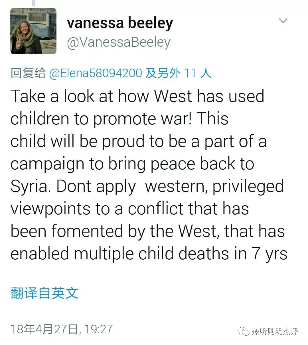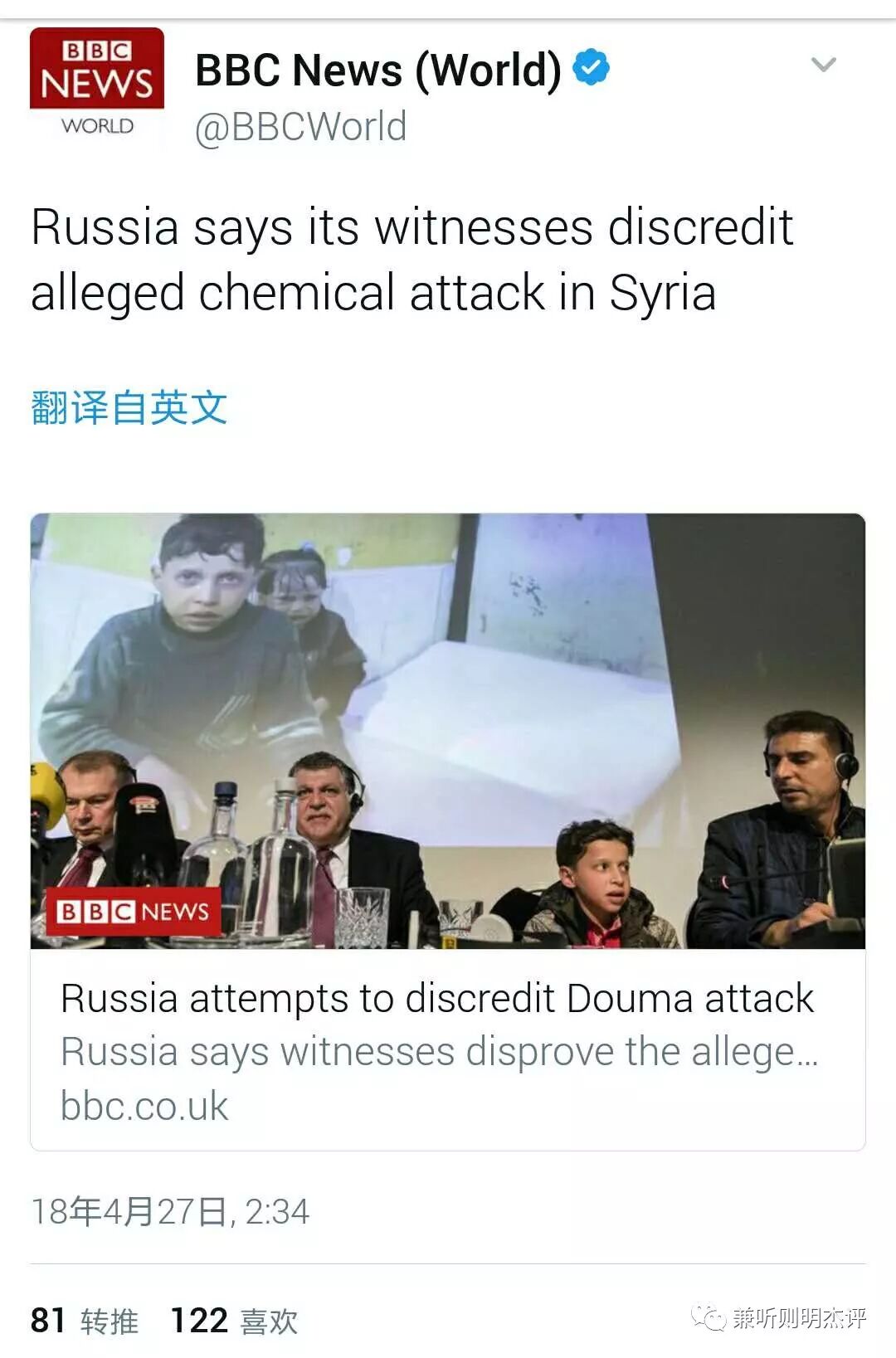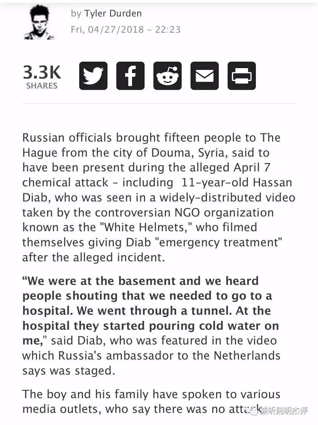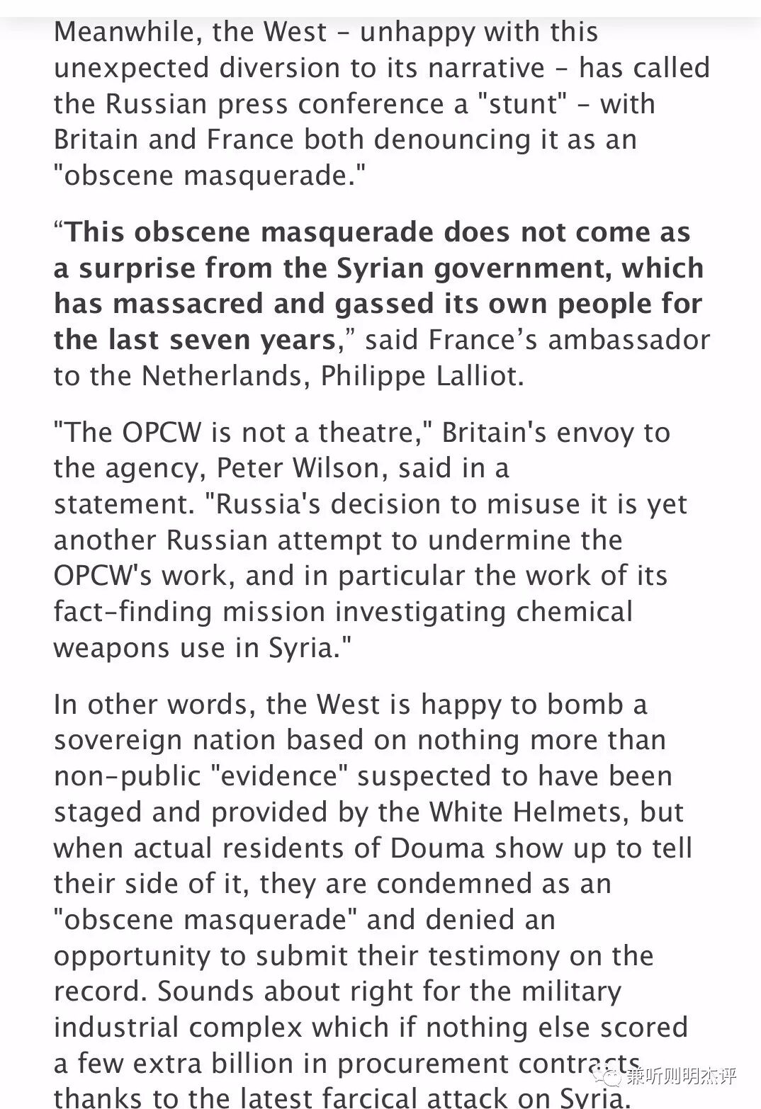 换句话说,西方世界很高兴非法轰炸一个主权国家,没任何实锤,只是基于白头盔提供的非公开“证据”,而这证据也被怀疑是摆拍,但当DouMa镇的目击者居民出现来告诉西方世界我们目击者所看见的事实,西方世界谴责这些目击者的证词是“下流的伪装”,并否决提交他们的证词成为正式官方记录报告的机会。但是对西方军工复合体来说,这种无根据轰炸的做法听起来很合适正确,因为如果没有一个战争借口理由,他们不能获得额外的数十亿美元的军火采购合同,多亏了最近对叙利亚的一次荒唐入侵轰炸。