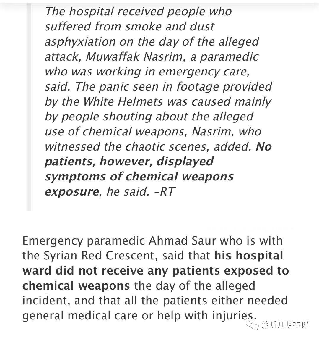俄罗斯还制造了一名医护工作人员,他说他当天在医院,还有一位急诊医生,他们都说那天病人的症状是由普通爆炸引起的烟尘所造成的。