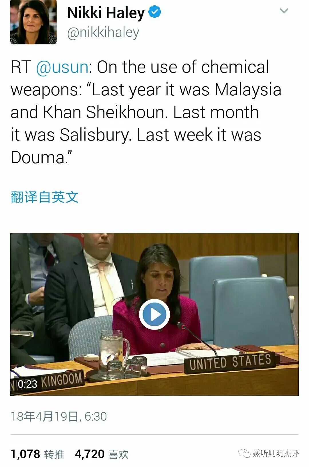 时至今日,美国驻联合国大使妮基·黑莉仍坚称叙利亚douma镇发生了化学武器毒气袭击。