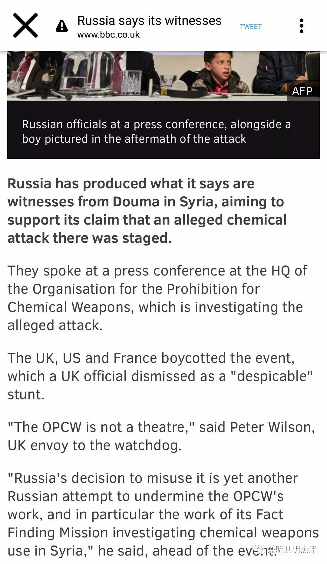 发生在叙利亚DouMa镇“化武事件”中的证人终于出现在国际禁止化武组织荷兰海牙总部,而这些证人们面对全世界所发表的证词,在西方主流媒体的报道里真相永远被埋藏: