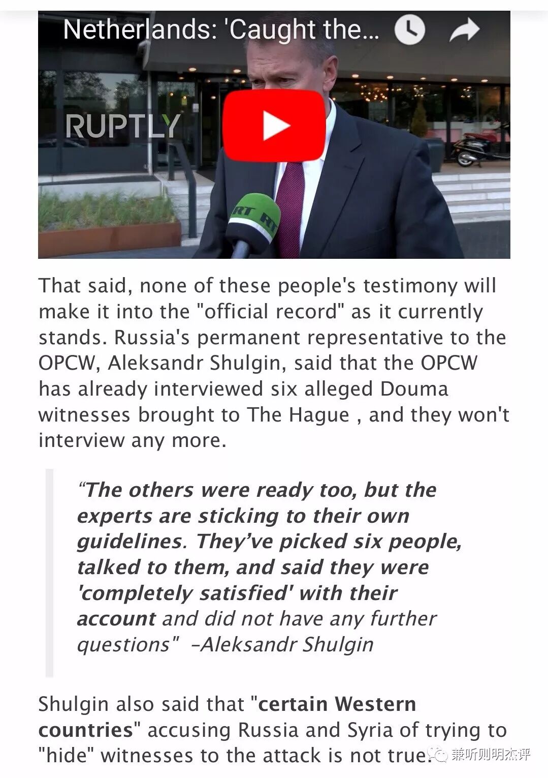 俄罗斯驻OPCW禁止化学武器组织的常驻代表Aleksandr Shulgin说:目前的形势,这些亲历目击者的证词没有一个能提交成为正式记录的官方报告(西方否决)。国际禁止化学武器组织已经采访了被带到海牙的六名的叙利亚DouMa镇证人,他们将不再进行采访。