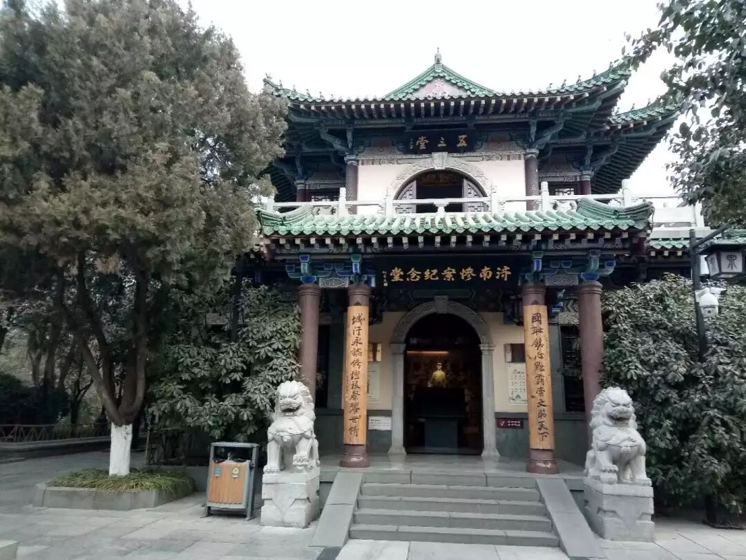 我们从公园的北门进入,沿着园内的小径,往东南方向走,首先来到了济南惨案纪念堂。