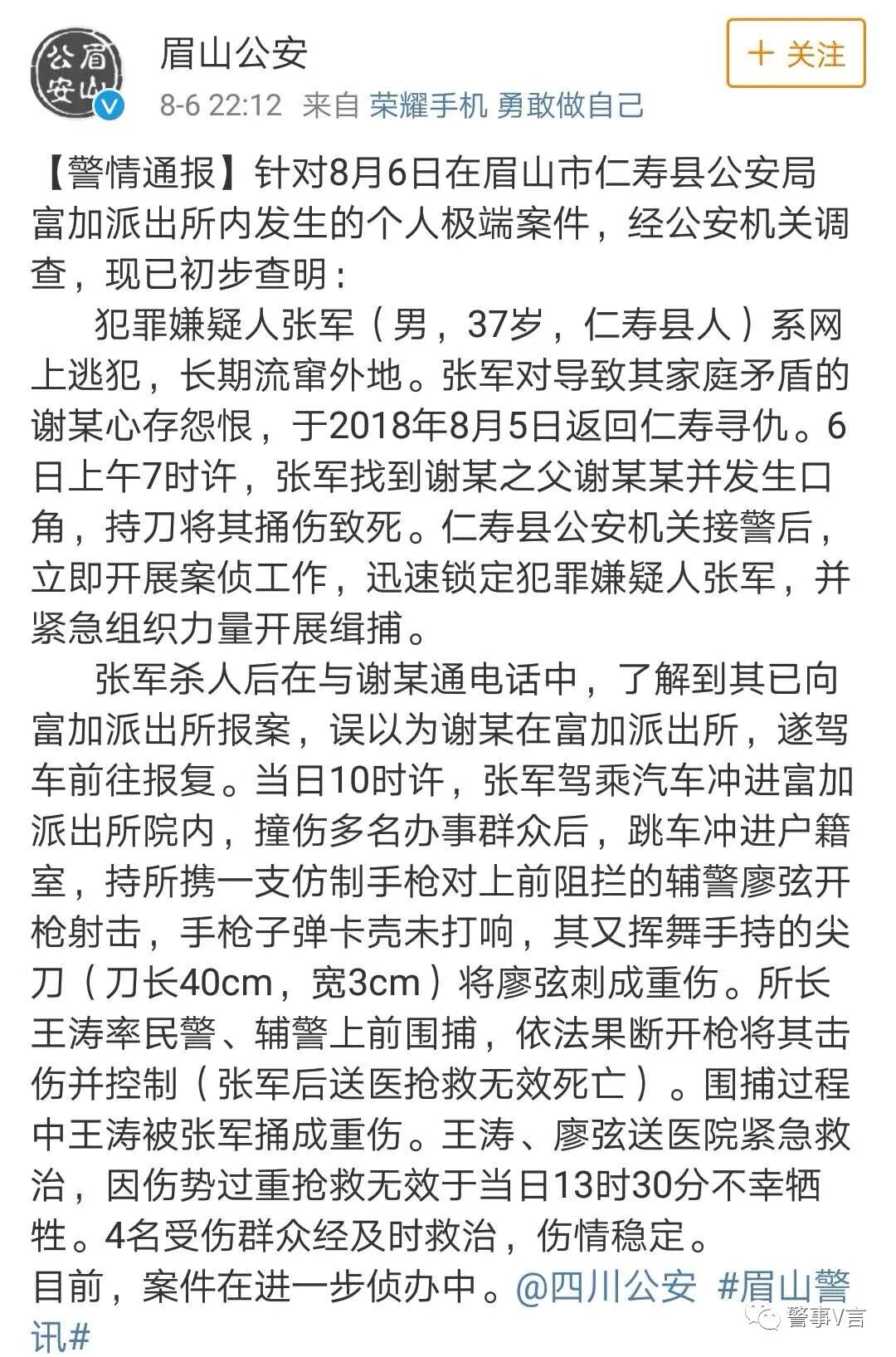 8月6日,四川仁县。当日10时许,一名身负命案的凶犯张某驾车突然冲进富山派出所,下车后持刀追砍现场人员,造成多民群众受伤。派出所所长王涛立即带领辅警廖弦与凶犯进行殊死搏斗,王涛所长在身受重伤的情况下开枪射击并击中嫌犯。嫌犯随后送医不治死亡,而王涛与辅警廖弦终因伤势过重,6日13时30分,不幸壮烈牺牲。另外四名受伤群众经救治均无生命危险。
