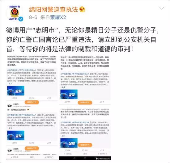 8月6日,四川绵阳网警在对发现网民@志明市 发表精日评论、辱国不当言论帖文,遂发帖文对其进行警示,面对绵阳网警的警告,@司波达也太君 胆大包天与警方公然开怼,高呼“安倍首相是我亲爹”、“老子不是洋奴,老子是精日”,并妄言“统一后中国警察会欺负台湾人民,所以台湾人民拒绝统一!”,甚至用杀警罪犯照片做头像挑衅警方,嚣张气焰不可一世。