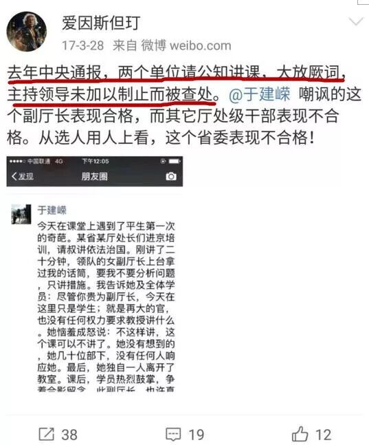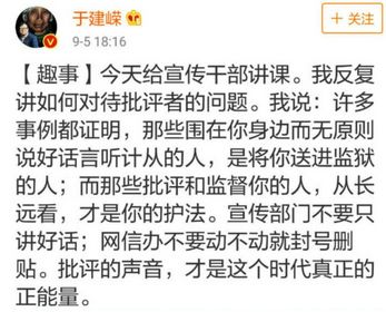 在帖子中,@于建嵘 先生表明了自己对“批评者”的态度,更将自己对“批评者”的态度“反复”讲给一些宣传干部听。老实说,我不想知道于建嵘先生授课的宣传干部来自哪里,更不想知道邀请于建嵘先生给宣传干部授课人的是何方神圣(尽管我由衷佩服这些人的胆量),我只是纯粹想和于建嵘先生探讨下对待“批评”和“批评者”的正确态度。