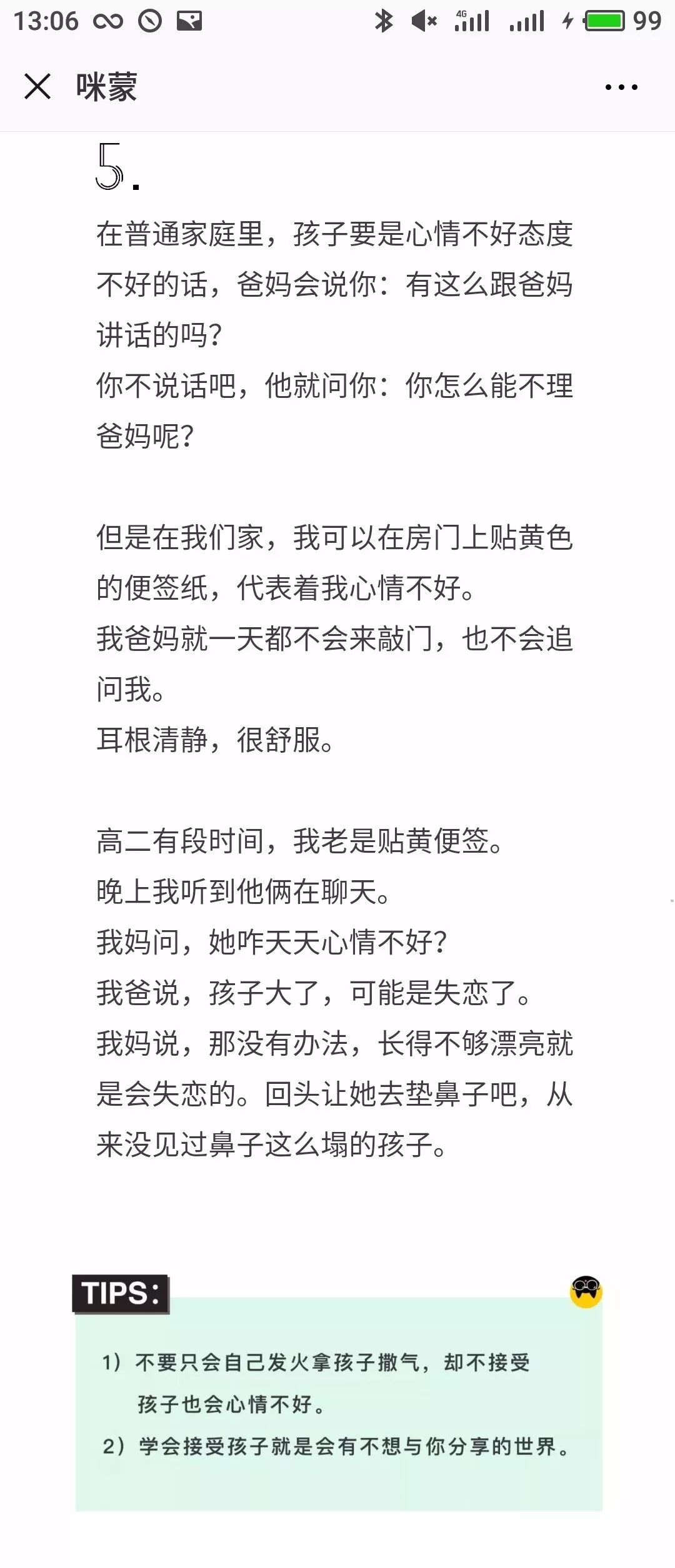 学会接受孩子就是会有不想与你分享的世界也特么得看情况吧?是女儿家的小心思还是卖白粉的小心思?前者不管你后者也不管么?孩子心情不好难道不是该疏导而不是假借不打扰的名义听之任之放任自流么?