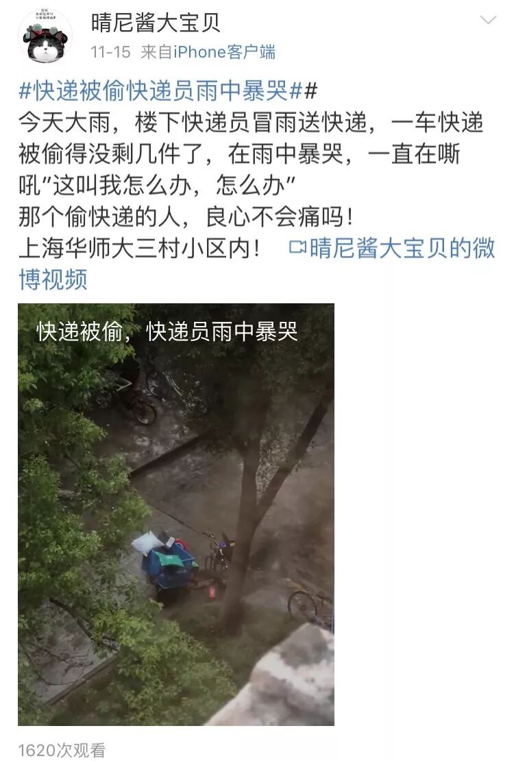 11月15日,有网友在微博爆料:“上海一快递员冒雨送快递,一车快递被偷得没剩几件。”