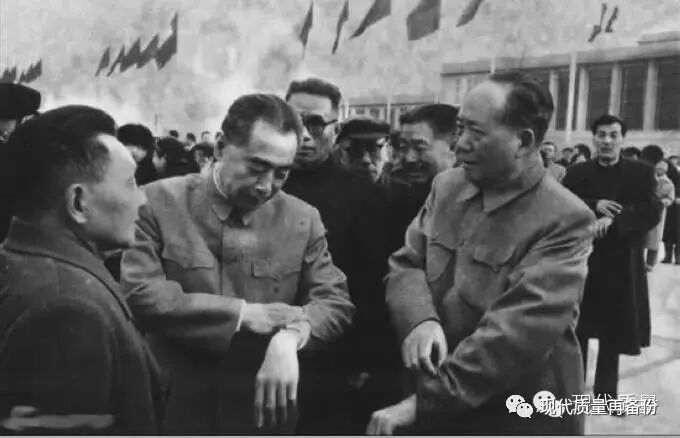 在北京机场等赫鲁晓夫时对表。此照引起苏联不满(1959),认为中国领导人在抱怨苏联人不守时——