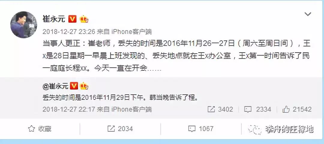 六、假设拍视频真的是王L清自己的意思,那么,应当是王L清主动找的崔永元(视频中有一段的开头是崔永元以采访的形式和王L清的对话),而且,他应当和崔永元都互有联系方式,另外,因为这件事情非常重大,他应当和崔永元有非常密切的交流,特别是在视频发出来之前,应当和崔多有沟通。但是,崔永元2018年12月27日的微博显示,崔永元甚至把王当成了韩(陕西千亿矿权案主审法官姓韩)!想一想,一个人把与自己命运攸关的事情托付给另一个人,而这个被托付的人竟然连托付者的姓都搞不清,这可能吗?那么,这说明了什么?这说明崔永元与王L清根本不熟悉,甚至在视频发出之前都没有联系过,也许在夏天录了视频之后就再也没有联系过(当然这只是猜测)!为什么不联系?合理的解释是:没有联系方式!网友@司马3忌 也注意到,崔永元1月8日微博发了个截图,显示的是他跟王L清的对话,截图显示他是02:41给王L清发的信息,而截图的时间显示的也是02:41,也就是说,崔永元刚给王L清发了信息之后就立即截图了!正常情况下,应当等一段时间看对方回复,但是他一分钟都没等,这说明他知道对方不会回复或者他不需要对方回复,也就是说,他所对话的这个微信好友应当不是王L清,他只需改一下所对话的这个微信好友的备注名,一个伪造的跟王L清的对话就形成了。那么,他为什么要伪造跟王L清的对话呢?合理的解释就是,他跟王L清没有联系方式,而为了显示他对王L清的关心以及制造王L清失踪的舆论氛围对法院方面施压,这个伪造的截图就产生了。当然,有的思维缜密的网友也许会说,崔永元也可能真的是跟王L清有微信联系,只是为了制造王L清失踪的舆论氛围施压最高院,所以不需要王回复就截图发出来了。但是,如果崔永元仅仅是制造舆论氛围施压最高院,那么,他完全没必要制造这个截图,直接在微博上说王L清联系不上不就行了吗?难道别人还会怀疑他跟王L清没有联系方式?相反,正因为他没有王的联系方式,他才会想着制造一个假象让人相信他跟王有联系方式。