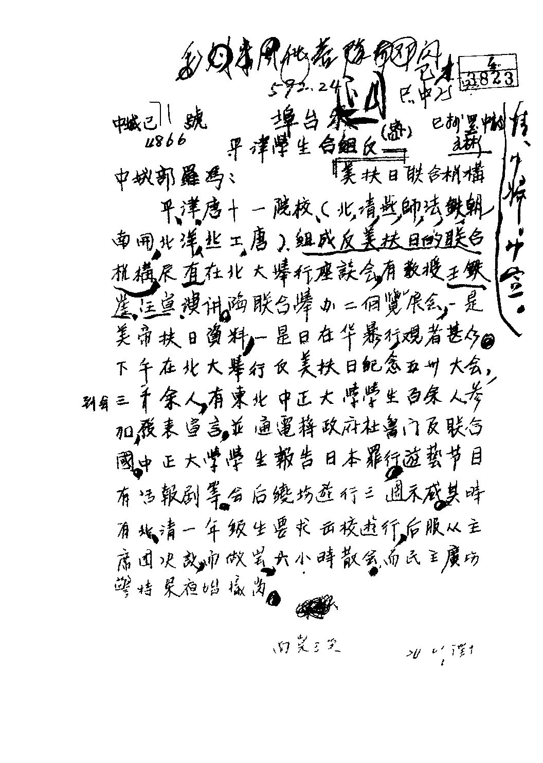 毛泽东曾评论说:“中国境内已有了两条战线。蒋介石进犯军和人民解放军的战争,这是第一条战线。现在又出现了第二条战线,这就是伟大的正义的学生运动和蒋介石反动政府之间的尖锐斗争”。