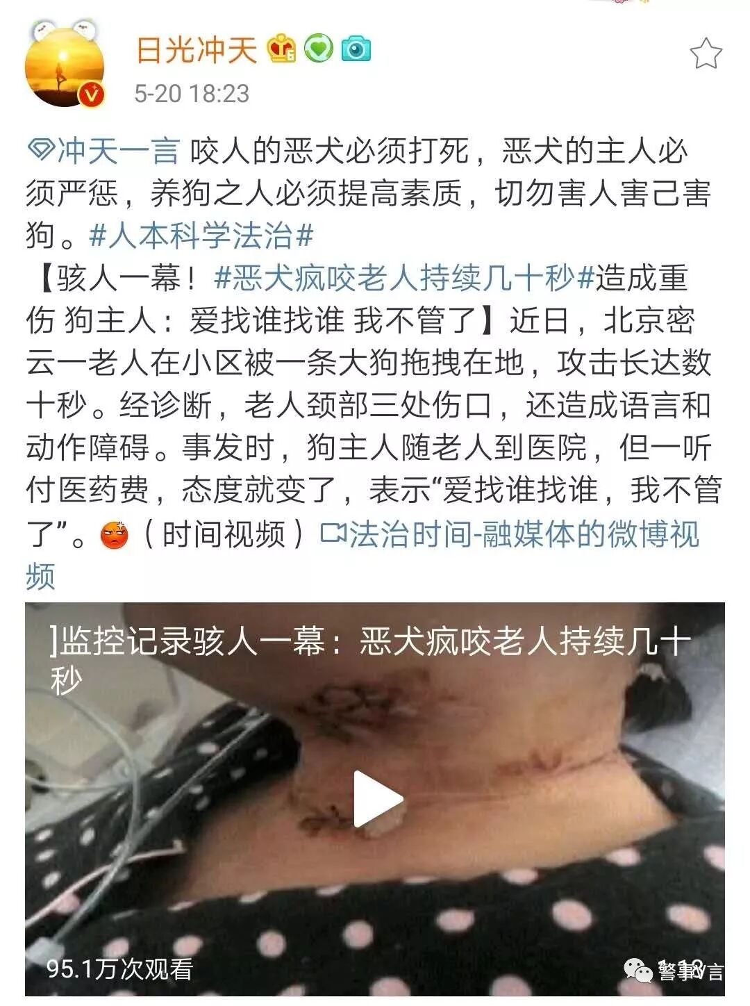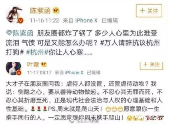 警事V言想问问这些所谓的爱狗人士:狗是生命,你要爱护,那鸡鸭鱼虾是不是生命?猪牛羊马是不是生命?你们有什么资格一边穿着名贵的皮草,一边吃着山珍海味,一边装着痛心疾首的样子指责扑杀咬人流浪狗的事?你们这么能装,就不怕哪天被雷劈了?